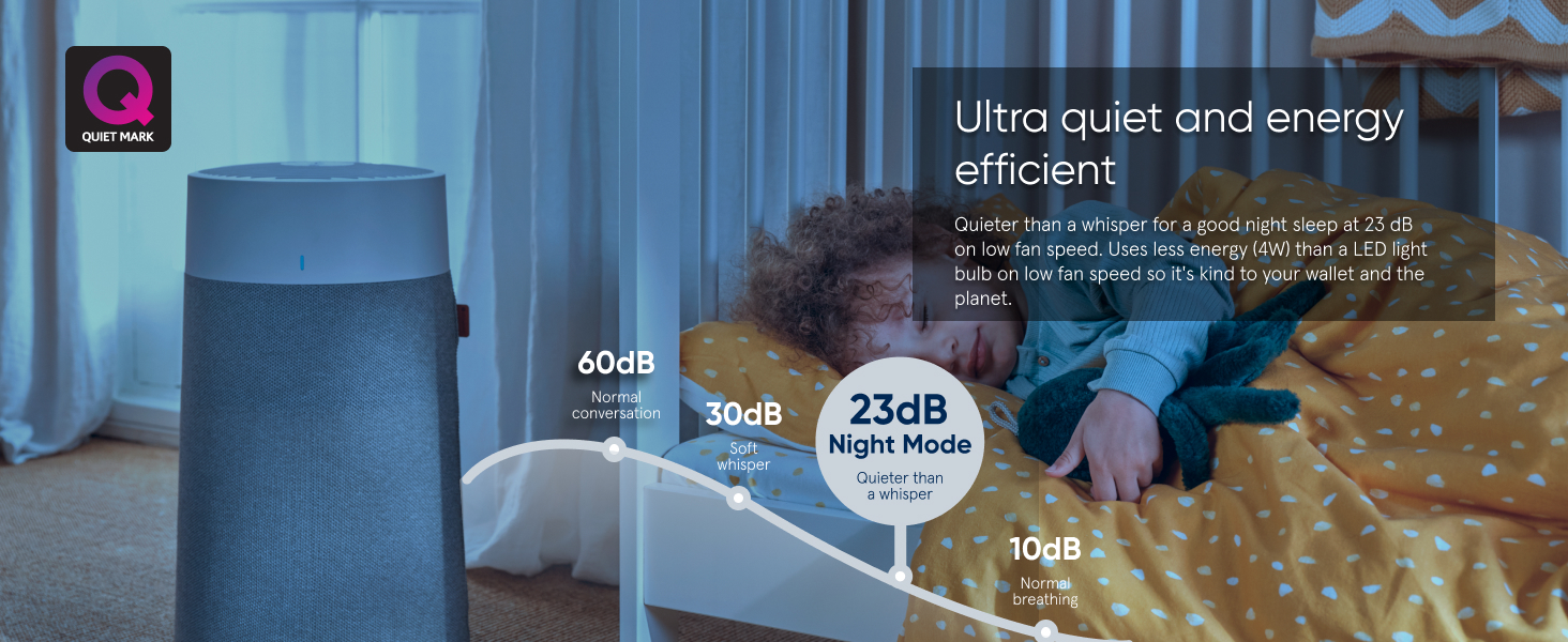 - ULTRA QUIET: Quieter than a whisper at only 23 dB on low fan speed, Quiet Mark certified air purifier, perfect for use in your bedroom for a good night sleep.