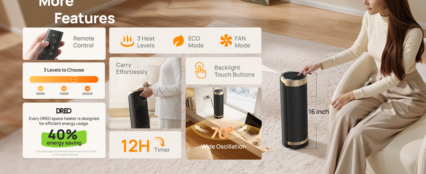 - Energy Efficiency: Save on energy bills and live more sustainably. With a built-in precise temperature sensor, the smart ECO mode adjusts the working mode independently (with a low of 900W, Middle of 1100W and high of 2000W) based on the ambient temperature.