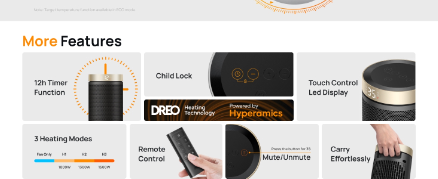 - Fits into your lifestyle: This portable heater handle makes it easier to carry and is equipped with multiple heating levels and modes to heat as you like (Power heat, ECO, Fan Only). It also features handy extras for a hassle-free experience (12-hour timer, mute, child lock, and memory function).
