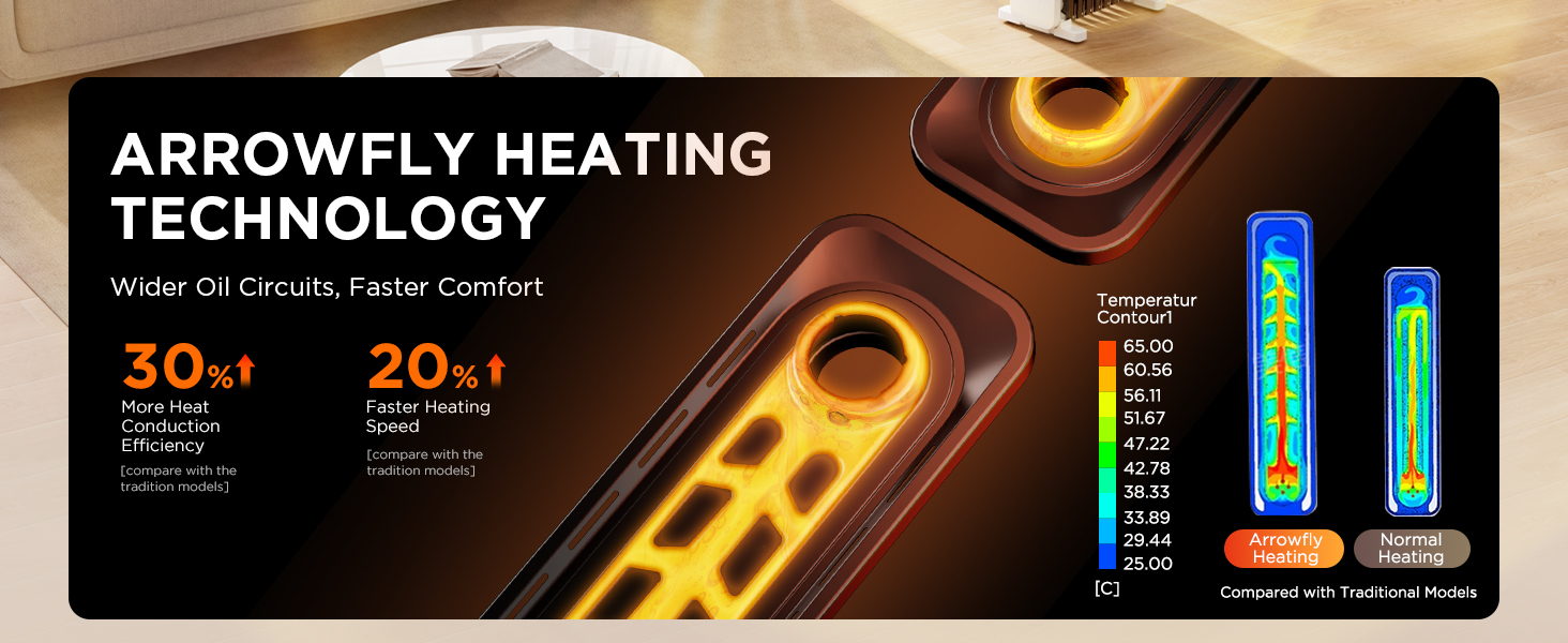 - Fast and Efficient Warmth: This radiator features innovative Arrowfly Heating Technology with a fishbone-shaped oil circuit for efficient heating. The 11-fin oil filled radiator quickly raises the room temperature and ensures even heat distribution across large spaces, providing consistent and comfortable warmth whenever you need it.