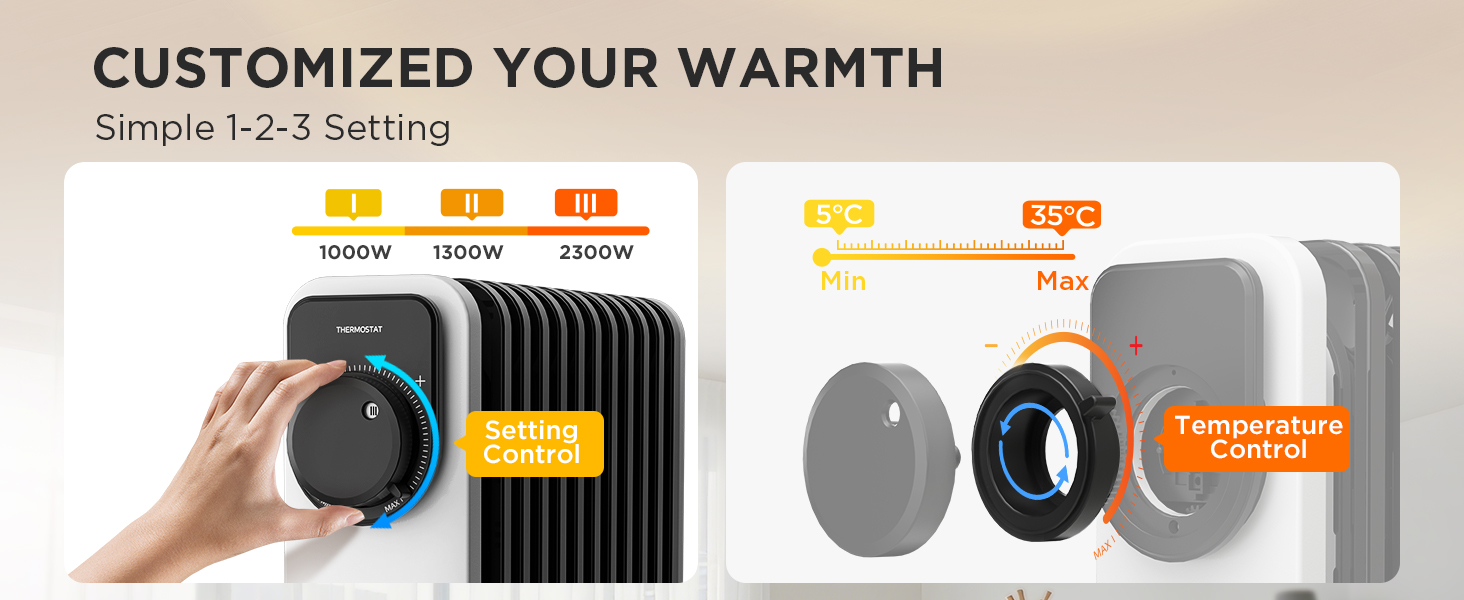 - High-Efficiency Heating in Silence: This 2300W oil filled radiator delivers powerful and consistent warmth with exceptional efficiency. Unlike noisy fan heaters, the electric heater operates silently, making it ideal for focused work or restful sleep. Filled with certified non-toxic heating oil, the oil radiator ensures safe and eco-friendly comfort, giving you complete peace of mind.