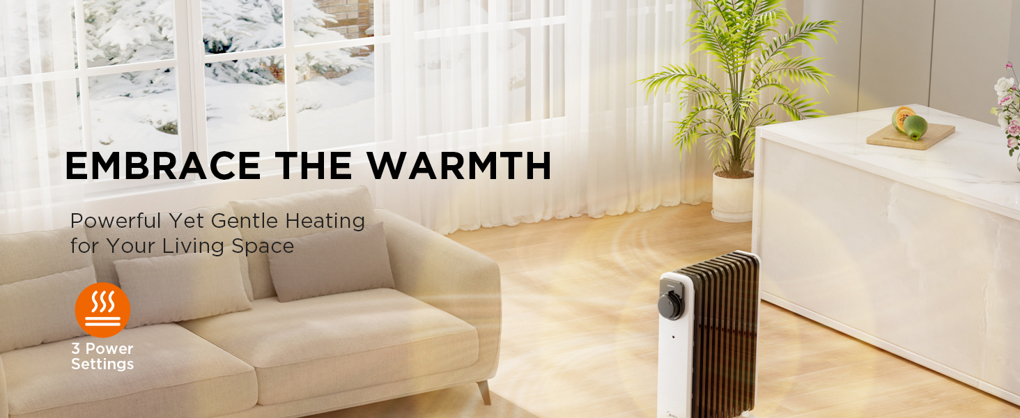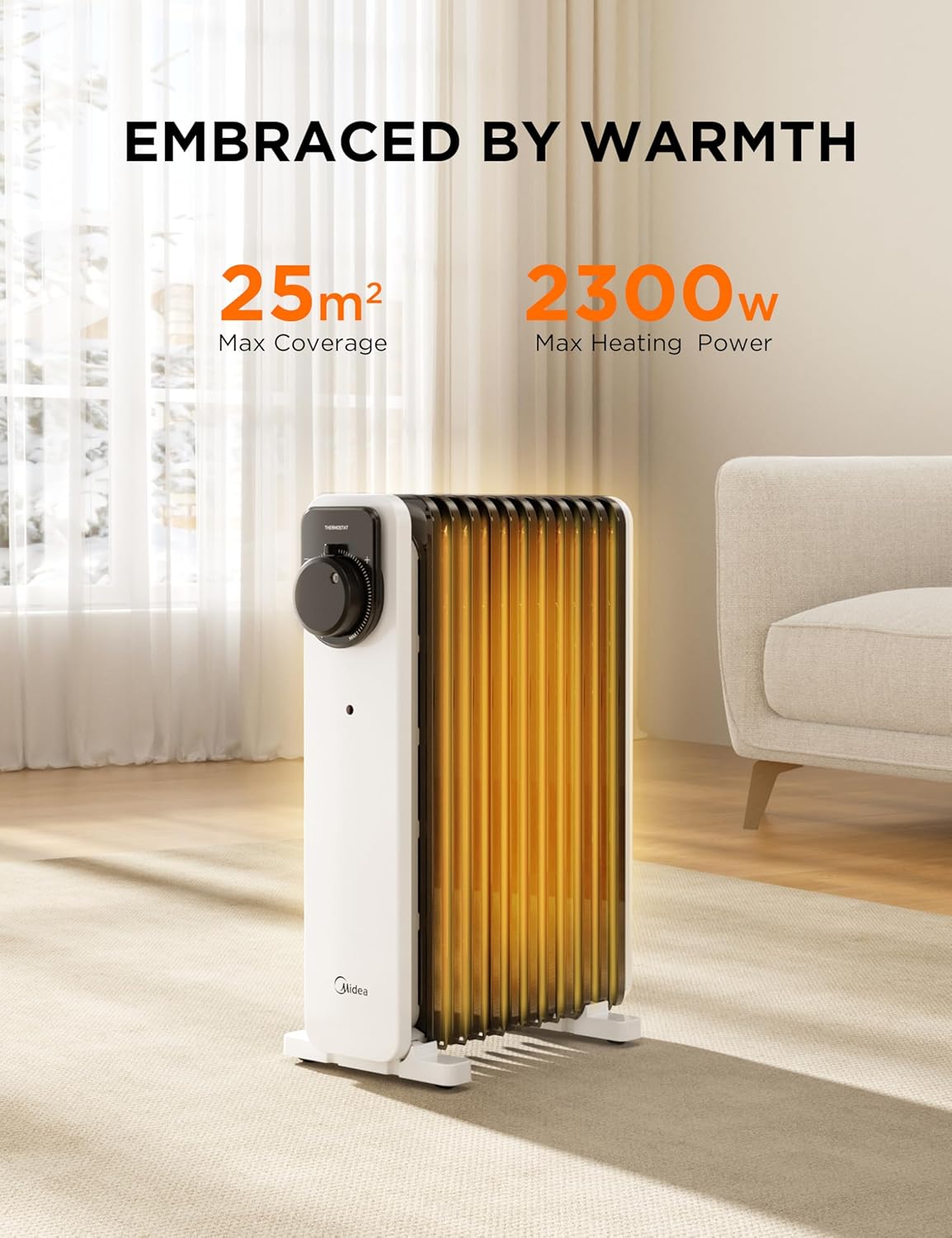Midea Oil Filled Radiator, 2300W, 11-Fin Portable Electric Heater with Knob Controls, Adjustable Thermostat, 3 Heat Settings, Tip-Over & Overheat Protection, UltraQuiet Operation for Office & Home Use.