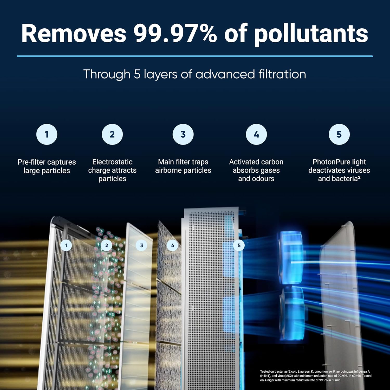 - FIRST AIR PURIFIER WITH PHOTONPURE TECHNOLOGY: Neutralizes germs trapped on the filters by emitting a specialized light that inactivates them, setting a new standard in air quality.